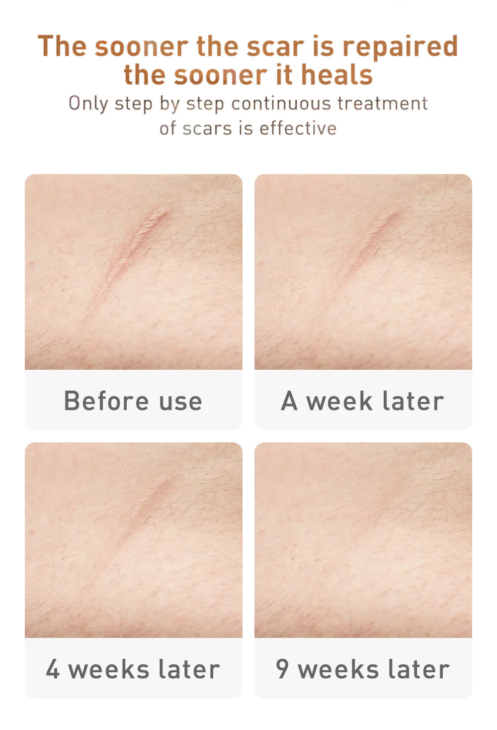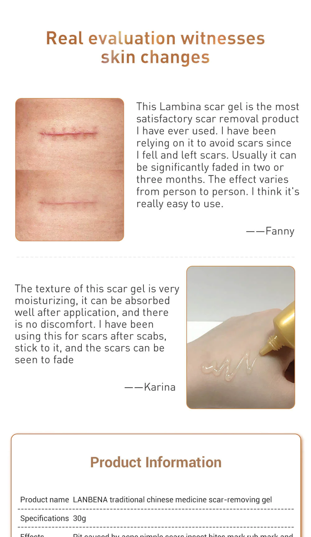 Caution: Use it several times daily.before use, clean and disinfect the wounds or scare, and apply some gel onto it with soft massage.