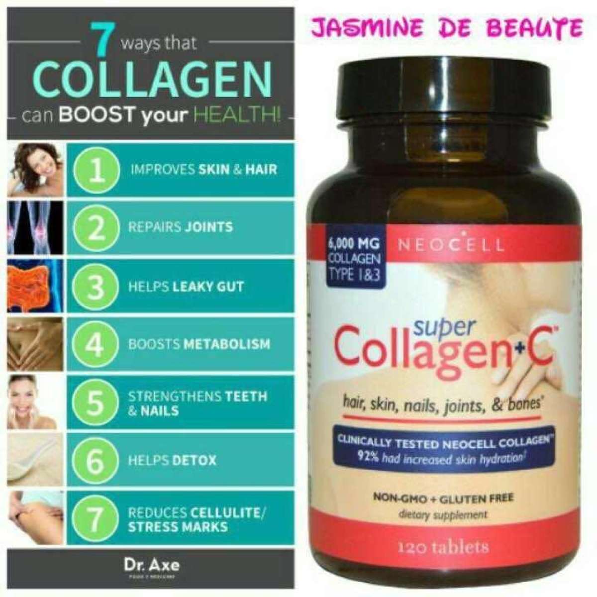 NeoCell Super Collagen+C is a dietary supplement promoting healthy hair, skin, nails, joints, and bones.